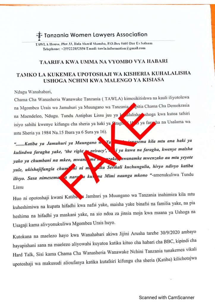 Kumekuwa na tamko ambalo linatembea mitandaoni linalohusisha TAWLA, tunaijulisha jamii ya watanzania kwamba tamko hilo sio la kweli na tunaomba lipuuzwe.